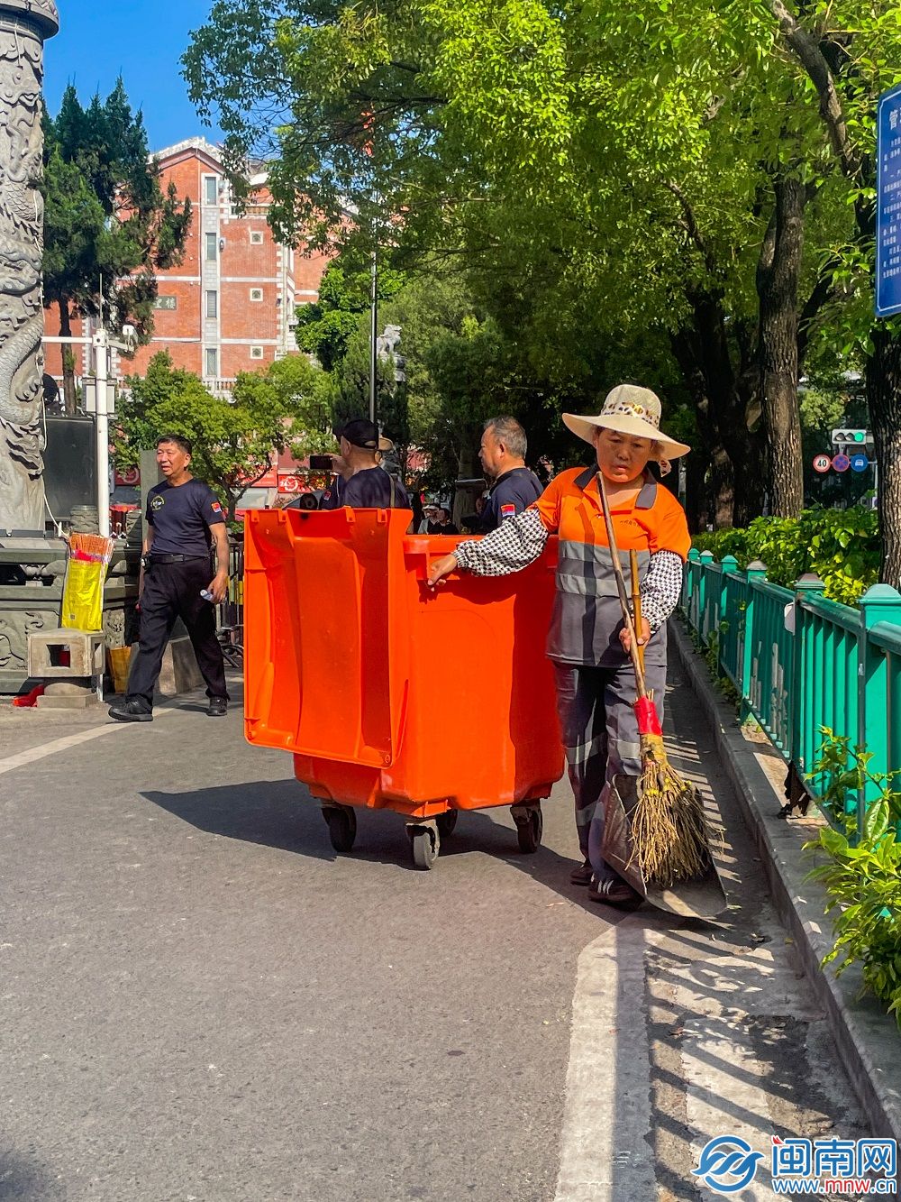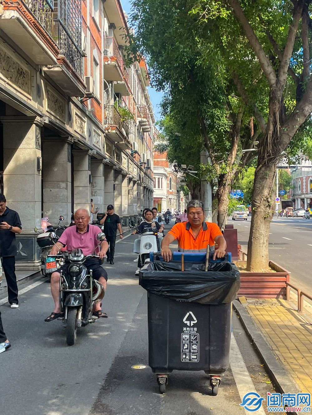 由于鲤城区的道路条件受限,在有机动车道与非机动车道隔离的道路上,非机动车道往往只能容纳两部电动车通行。因此,在较为狭窄的路段,刺桐鲤市政推行环卫工手推桶作业。